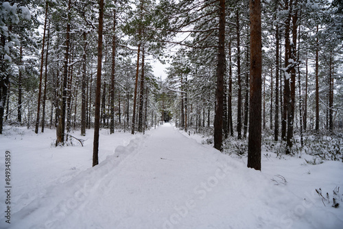 A forest in Estonia in Winter, the pines are covered with snow and everything looks calm, the snow offers a clear and bright image that contrasts with the green of the trees