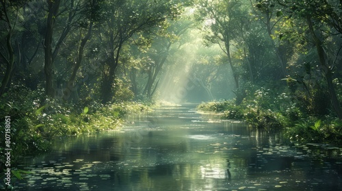 A forest with a river running through it. The water is calm and the sun is shining through the trees