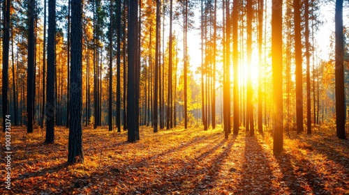 A forest with trees in the background and a sun in the foreground