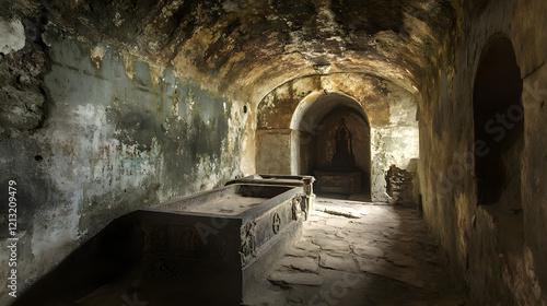 A forgotten crypt in the heart of an ancient city, where the air is thick with dust, and the stone walls whisper the names of long-dead rulers.