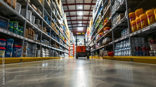 A forklift is driving down a long aisle of a warehouse filled with paint cans