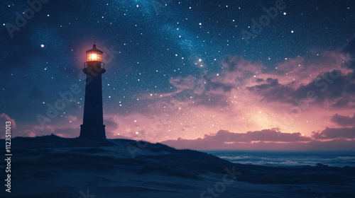 A forlorn lighthouse stranded in an arid desert basin, its silhouette blending with the starlit sky.
