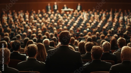 A formal gathering of professionals, with a speaker addressing a large audience, showcasing a sense of unity and engagement among attendees.