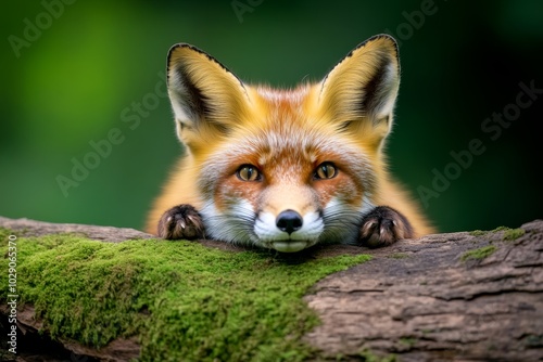 A fox peeking out from behind a moss-covered log, blending seamlessly into the magical landscape of the deep European forest
