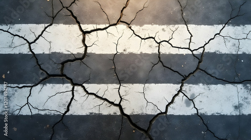 A fractured crosswalk, lines of white and gray asphalt, deeply cracked and broken, symbolizing urban decay or environmental stress. A stark image of deterioration.