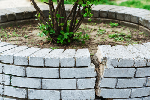 A fragment of a destroyed white brick flower bed. Close-up