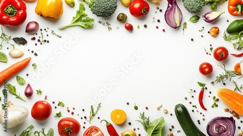 A frame of fresh vegetables, herbs, and spices on a white background with a blank space in the middle.