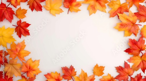 A frame of orange and yellow autumn maple leaves isolated on white background.