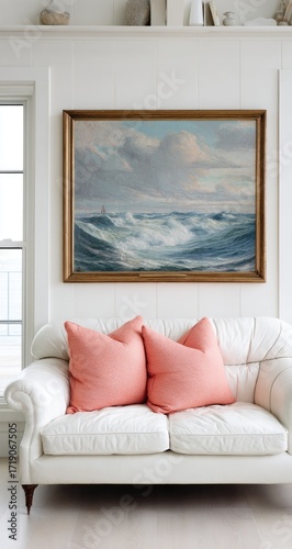 A framed seascape painting hangs above a white sofa with coral pillows in a bright, airy room