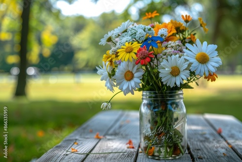 A fresh and cheerful flower arrangement of daisies and marigolds in a clear mason jar, set on a picnic table.