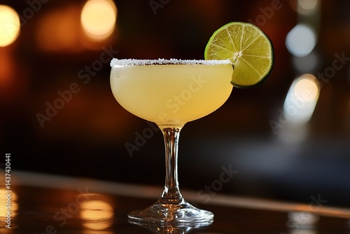 A fresh and tangy lime margarita, served in a salted glass with a wedge of lime