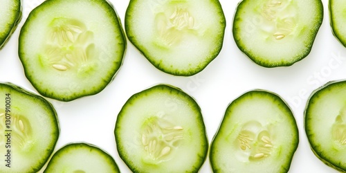 A fresh bunch of cucumber slices arranged beautifully on a white background