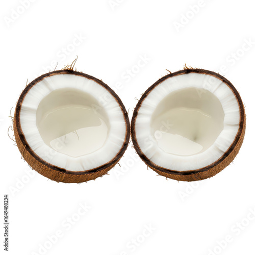 A Fresh Coconut Cut in Half, Revealing Its Tropical Flesh and Water on a Clean White Background