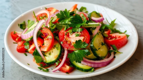 A fresh, colorful salad made with tomatoes, cucumbers, onions, and parsley, elegantly presented on a pristine white plate, radiating health and taste.