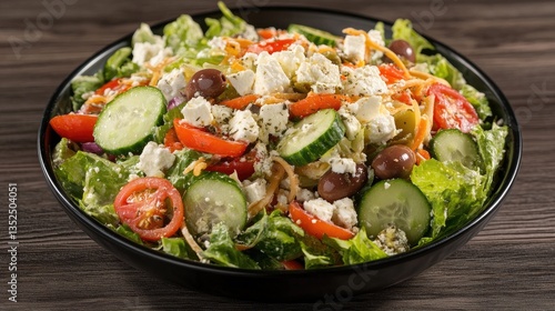 A fresh Greek salad with feta cheese, olives, and cucumber.