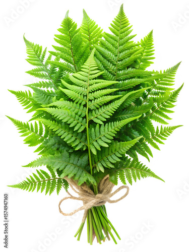 A fresh green fern bouquet tied with a rustic rope is isolated on transparent background