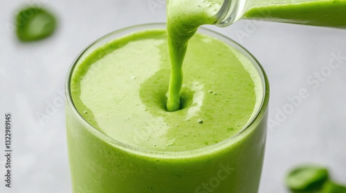A fresh green smoothie being poured into a glass, vibrant color and healthy ingredients