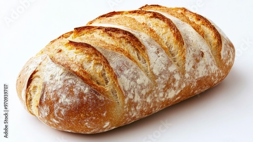 A fresh loaf of artisan bread with a crispy crust and soft interior, placed on a clean white background