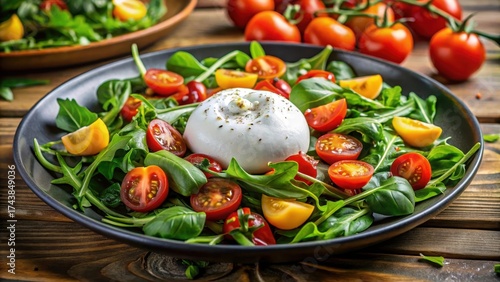 A fresh mix of summer greens like arugula and spinach with creamy burrata cheese and juicy tomatoes, seasonal ingredients, outdoor setting