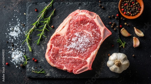 A fresh, raw pork steak on a dark stone board, surrounded by coarse salt, pepper, and garlic cloves, top-down view
