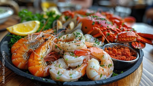 A fresh seafood platter, with shrimp, crab, and lobster.