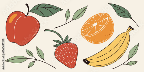 A fresh, sweet set of healthy cartoon fruit illustrations including orange, apple, strawberry, lemon, banana, pineapple, cherry, and pear designs