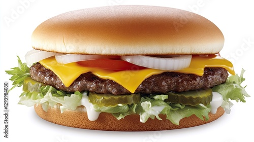 A fresh, tasty burger with a beef patty, cheese, lettuce, tomato, and pickles, viewed from the top.