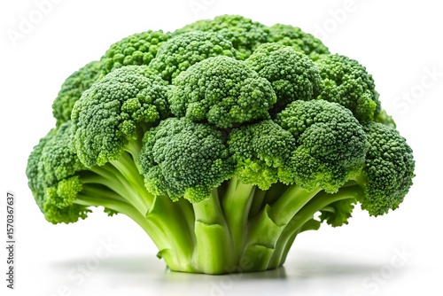 A fresh vibrant head of broccoli showcasing its intricate florets and thick green stalk against a clean white background