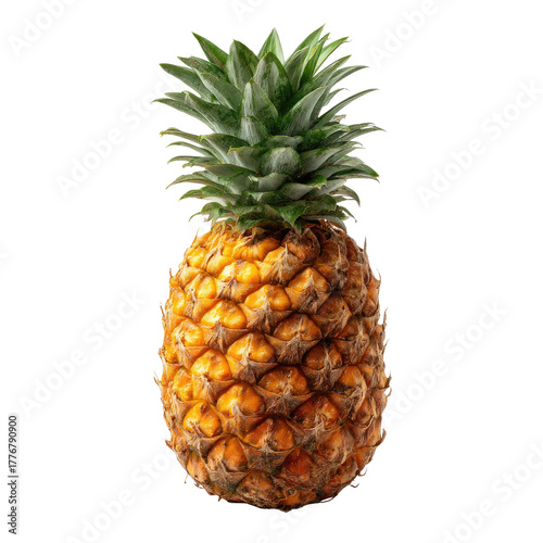 A fresh, whole pineapple stands upright, showcasing its vibrant green crown and characteristic golden-brown, textured skin against a plain background. background removed