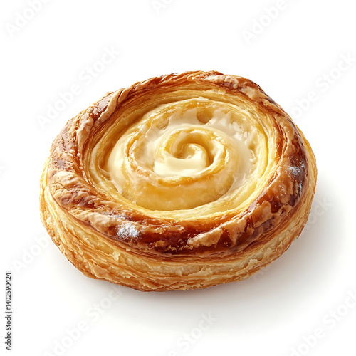 A freshly baked Danish pastry with a golden brown crust, visible cream cheese filling, and a light sugar glaze