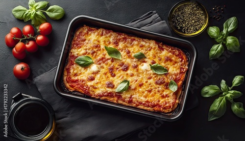 A freshly baked lasagna in a black baking dish, topped with melted cheese, green basil leaves, and placed on a dark cloth