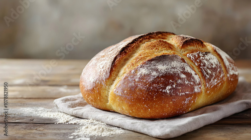 A Freshly Baked Loaf of Bread Rests on a Linen Napkin, Dusting the Wooden Table with Flour.