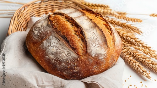 A freshly baked loaf of bread with a crispy crust and a soft interior rests on a white linen cloth, surrounded by wheat stalks.