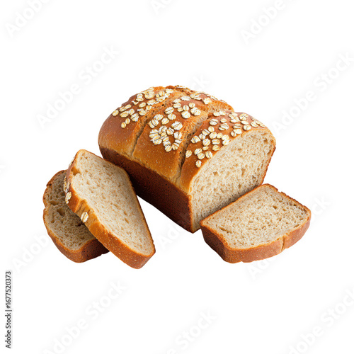 A freshly baked loaf of whole grain bread with a crusty exterior, topped with oats, alongside two slices.