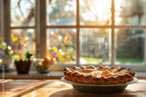 A freshly baked pie cooling on a windowsill, with a softly blurred background of a sunny kitchen