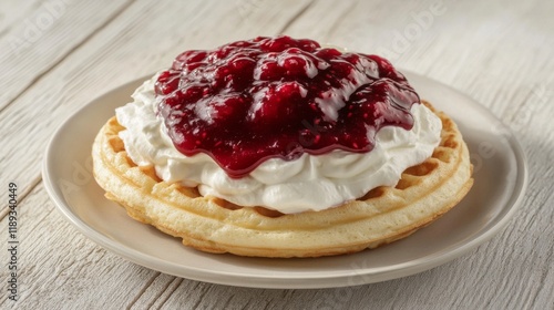 A freshly baked waffle topped with a generous layer of whipped cream, drizzled with berry sauce, placed on a simple plate with a light wood backdrop.