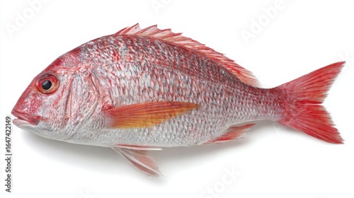 A freshly caught red snapper fish lies on a clean white surface, highlighting its bright red skin and shimmering scales. The fish's fins are extended, emphasizing its natural shape