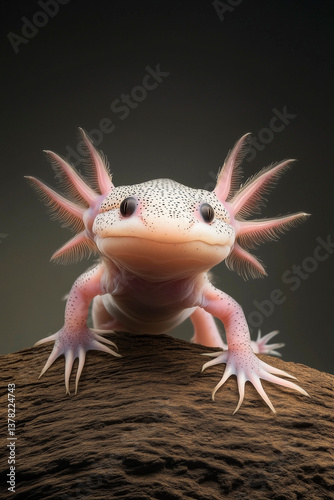 A freshwater axolotl, its feathery external gills gently swaying, pale pink skin and dark eyes in hyperrealistic detail, dark soft-focus background, National Geographic wildlife photography