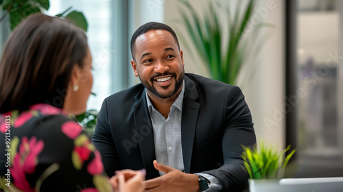 A friendly businessman in a suit having an engaging discussion with a colleague in a modern office setting, creating a positive work environment.