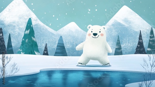 A friendly cartoon polar bear ice skating on a frozen pond, surrounded by snowy mountains and winter trees.