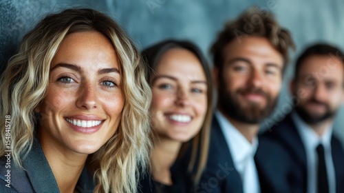 A friendly group portrait showcases smiling individuals in professional attire, highlighting a sense of teamwork and positivity in a business setting.