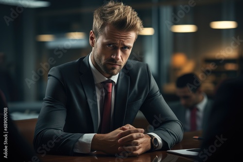 A friendly looking manager comforts his sad employee in his office.