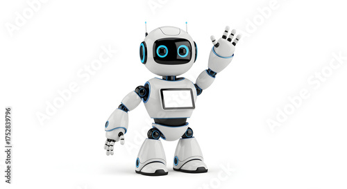 A friendly modern white robot with blue accents waving its hand in greeting, isolated on a white background.