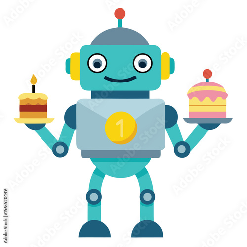 A friendly robot holding a birthday cake on a plain background, representing futuristic celebrations and technology