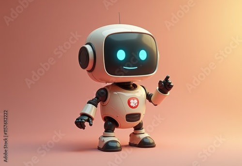 A friendly white robot with blue eyes and a red clover on its chest points its finger to the right.