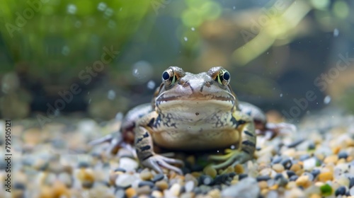 A frog peeks over the still waters, its reflection and the life surrounding it creating a tranquil natural habitat scene