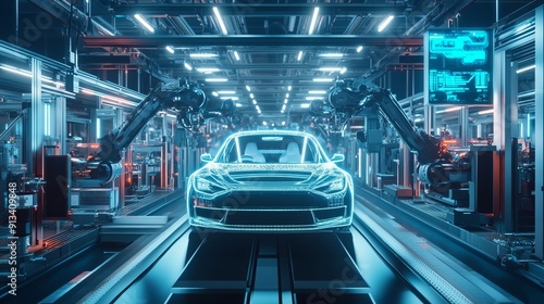 A frontview digitalization of a car factory shows an automated robot arm assembly line manufacturing hightech sustainable electric vehicles with futuristic AI computer vision analyzing