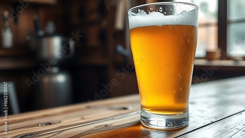 A frosted beer glass with condensation droplets, resting on a rustic wooden table.