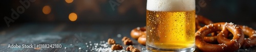 A frosted beer mug, condensation dripping, next to pretzels , drinkware, snack