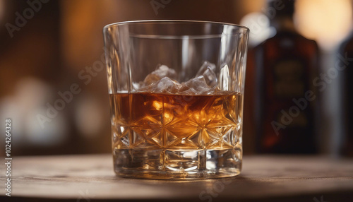 A frosted whisky glass rests on a wooden barrel beside an unbranded, unwritten whisky bottle, with ample copy space.